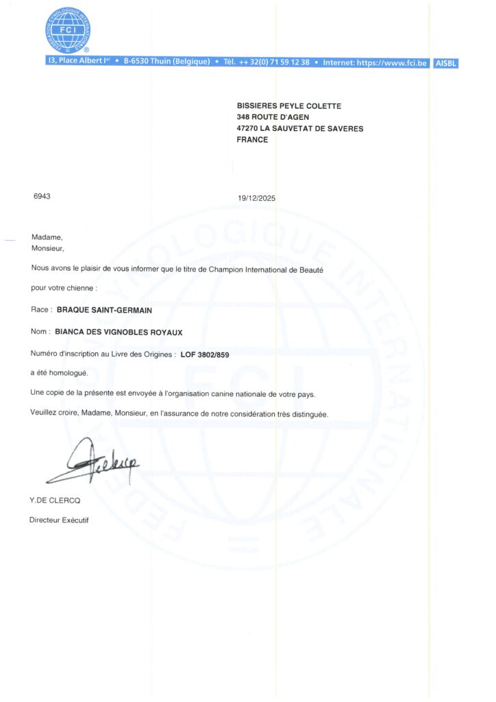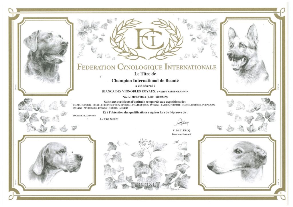 Titres obtenus par Bianca – Braque Saint Germain – en expositions de beauté et concours de travail.