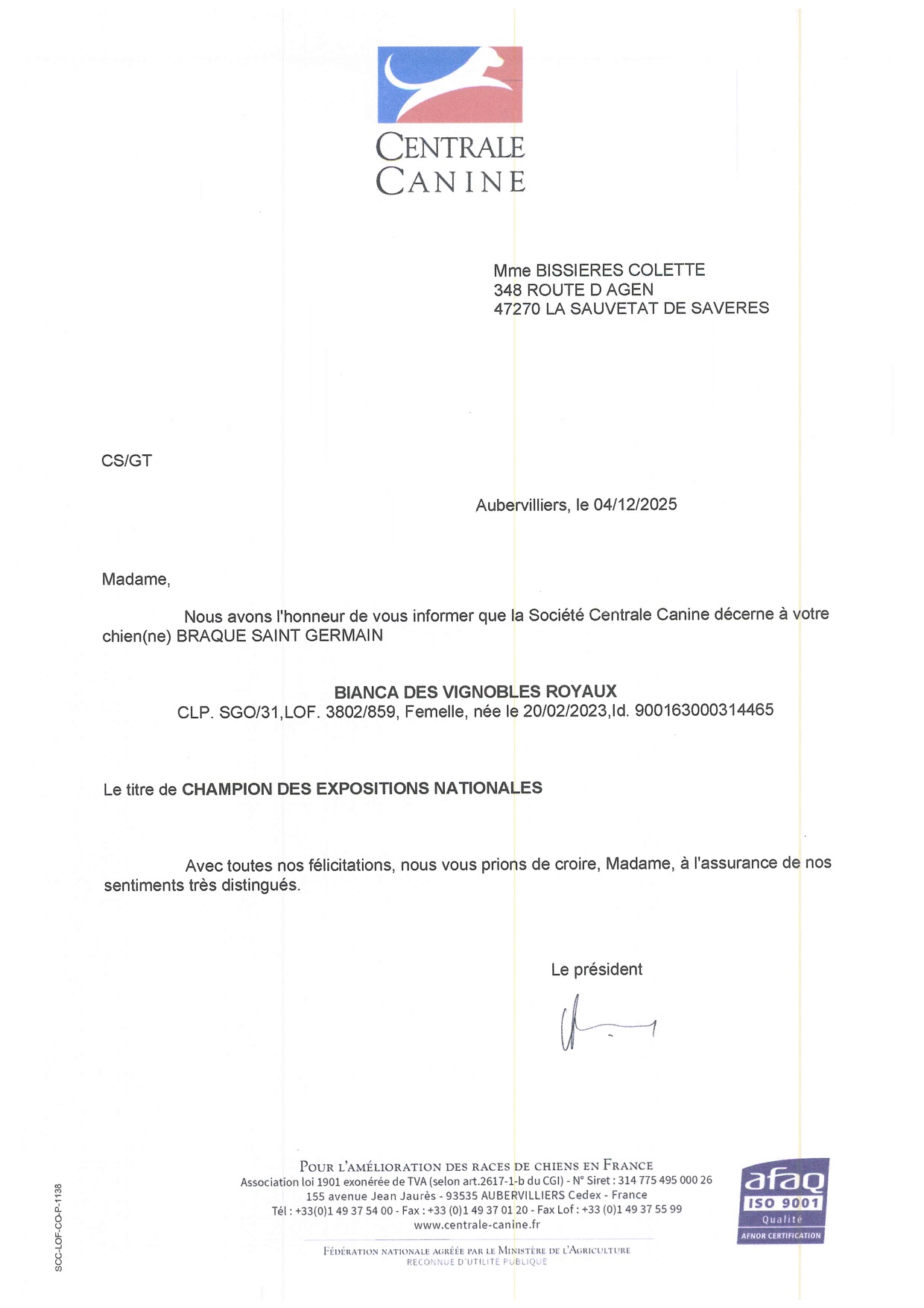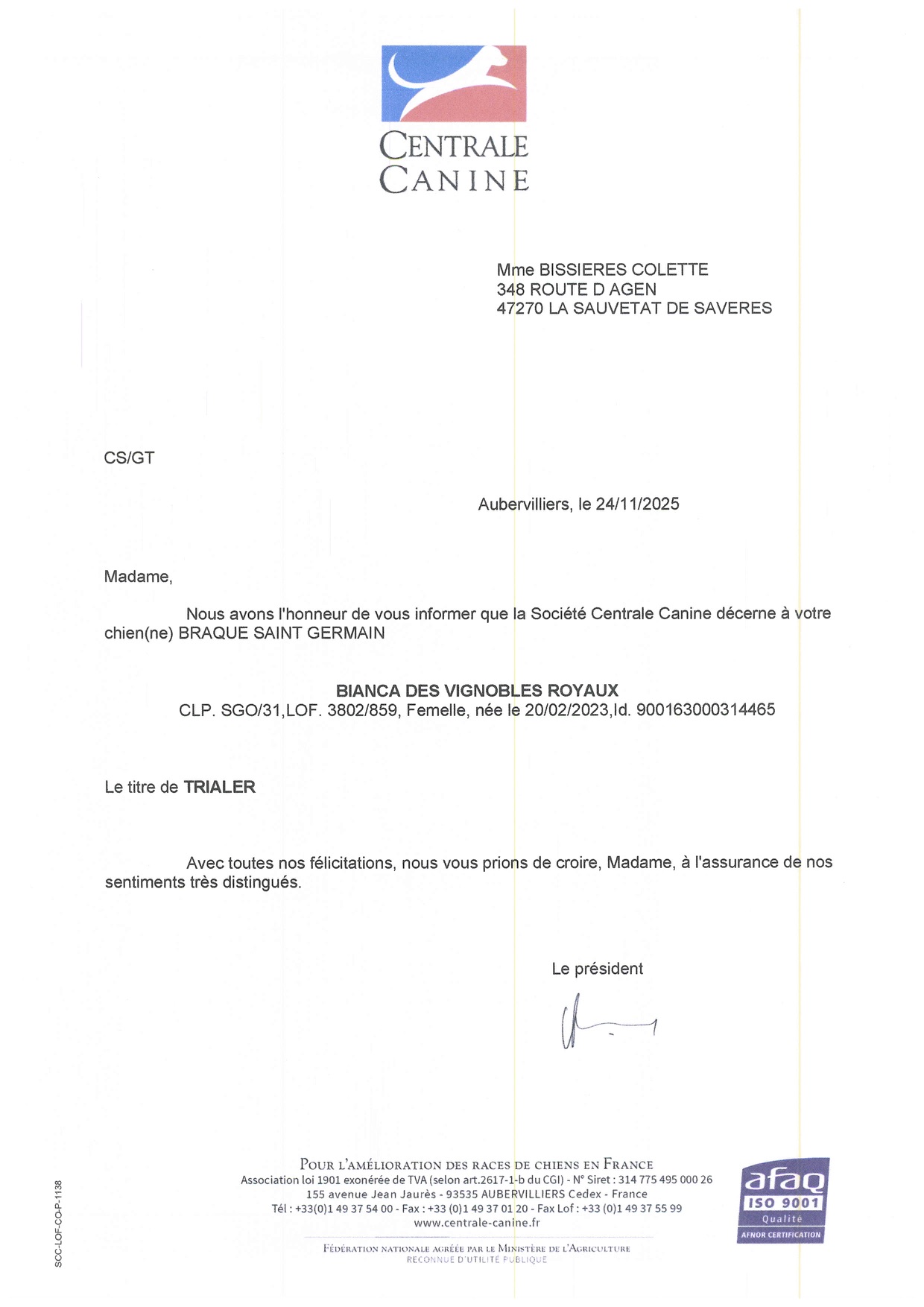 Titres obtenus par Issan – Braque Saint Germain – en expositions de beauté et concours de travail.